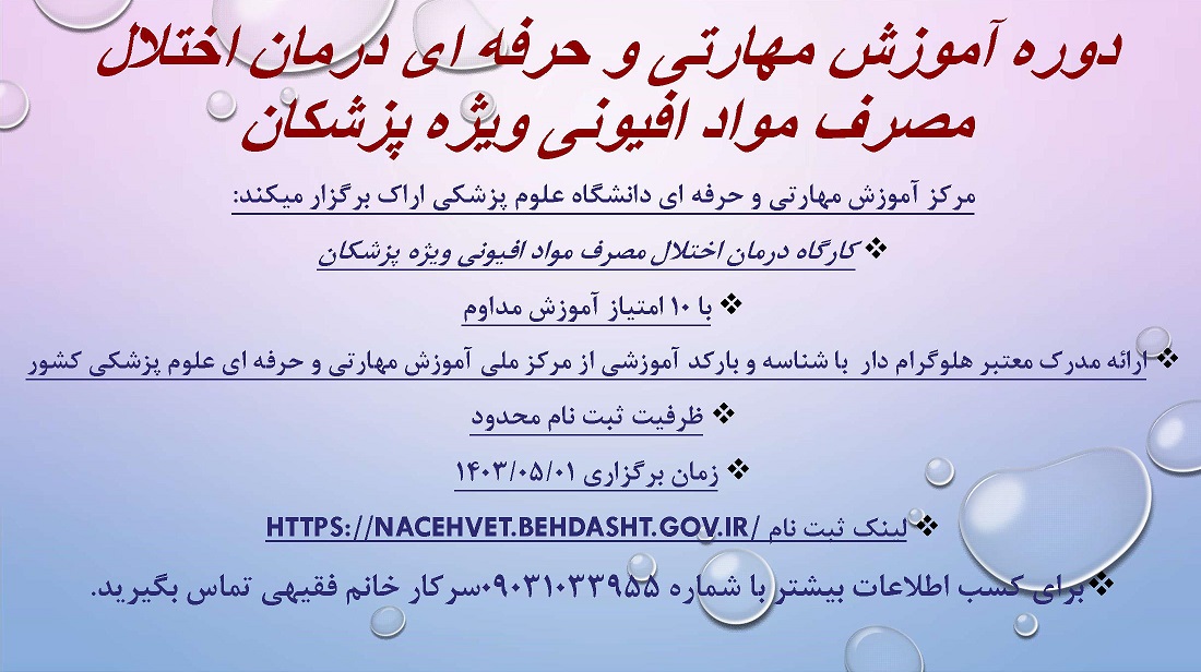 مرکز آموزش مهارتی و حرفه ای دانشگاه علوم پزشکی اراک در نظر دارد دوره آموزشی و مهارتی "درمان اختلال مصرف مواد افیونی ویژه پزشکان" را برگزار نماید .