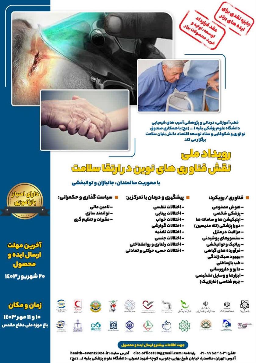 برگزاری رویداد ملی نقش فناوری های نوین در ارتقاء سلامت با محوریت سالمندان و جانبازان در تاریخ های ۱۰ و ۱۱ مهر توسط دانشگاه علوم پزشکی بقیه الله (عج) با مشارکت صندوق نوآوری و شکوفایی