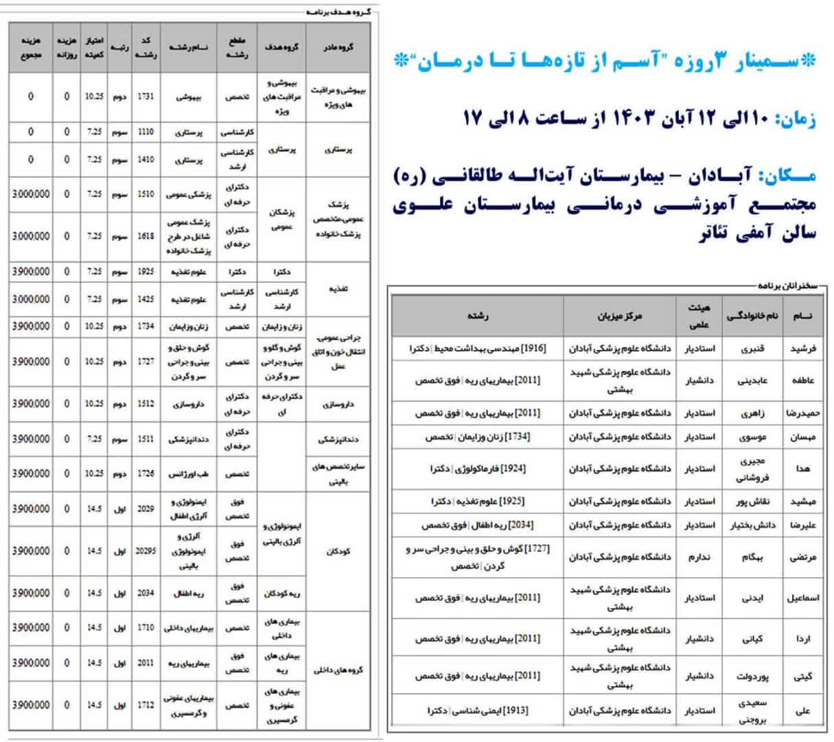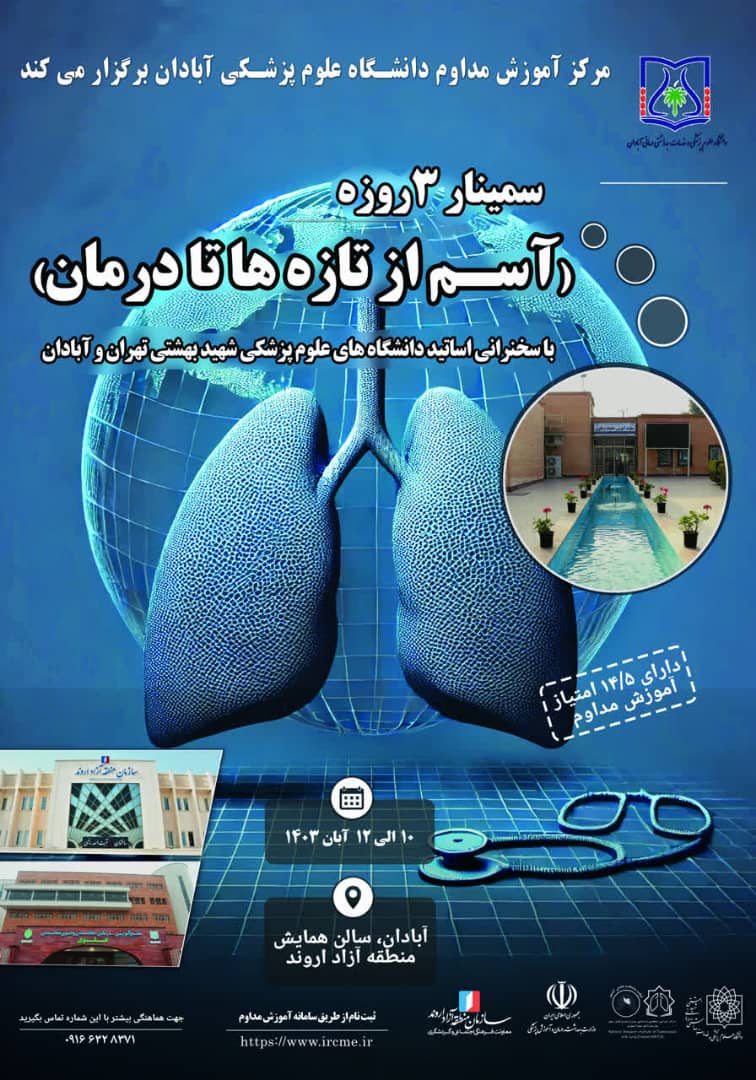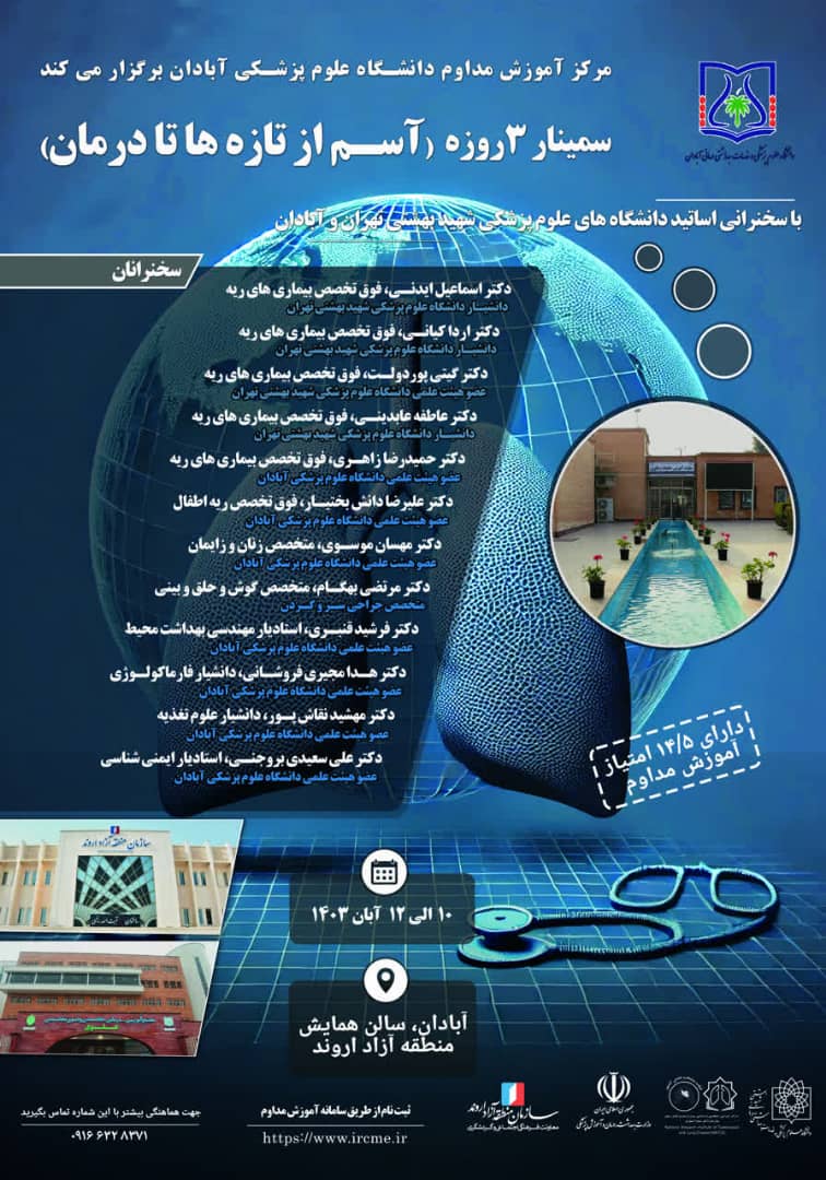 به آگاهی می رساند مرکز آموزش مداوم دانشگاه علوم پزشکی آبادان در نظر دارد سمینار سه روزه آسم از تازه ها تا درمان را در تاریخ ۱۰ الی ۱۲ آبان ماه به شرح پیوست و با سقف ۱۴٫۵ امتیاز بازآموزی برگزار نماید.