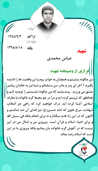فرازی از وصیت نامه شهید بزرگوار عباس محمدی :
