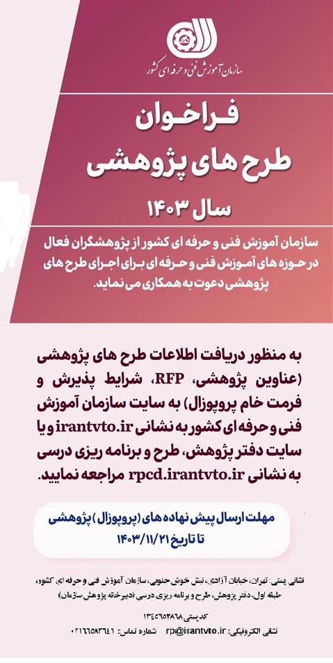 سازمان آموزش فنی و حرفه ای کشور از پژوهشگران فعال در حوزه آموزش فنی و حرفه ای برای اجرای طرح های پژوهشی دعوت به همکاری می نماید.