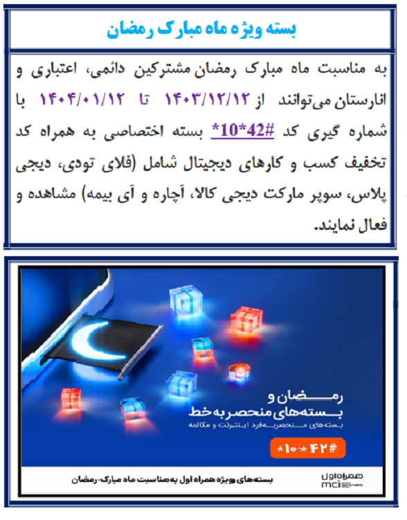بسته ویژه ماه مبارک رمضان ۱۳ اسفند ۱۴۰۳ | ۰۹:۳۰ کد : ۴۹۹۵۸ اطلاعیه ارسال به دیگران نام شما ایمیل شما ایمیل دریافتکننده ارسال انصراف تعداد بازدید:۶۷۶۹ بسته ویژه ماه مبارک رمضان