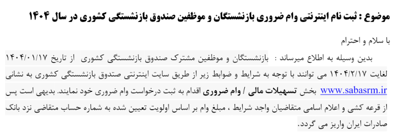 ثبت نام اینترنتی وام ضروری بازنشستگان و موظفین صندوق بازنشستگی کشوری ۲۰ فروردین ۱۴۰۴ | ۱۱:۵۹ کد : ۵۰۶۴۱ اطلاعیه ارسال به دیگران نام شما ایمیل شما ایمیل دریافتکننده ارسال انصراف تعداد بازدید:۵۰۴۷ ثبت نام اینترنتی وام ضروری بازنشستگان و موظفین صندوق بازنشستگی کشوری