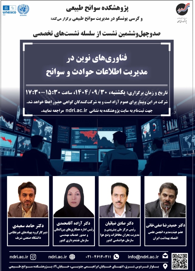 نشست فن آوری نوین در مدیریت اطلاعات حوادث وسوانح ۳۰ آذر ۱۴۰۴ | ۱۲:۰۴ کد : ۵۷۱۴۹ اطلاعیه ارسال به دیگران نام شما ایمیل شما ایمیل دریافتکننده ارسال انصراف تعداد بازدید:۱۲۹۱ دعوتنامه نشست فن آوری نوین در مدیریت اطلاعات حوادث وسوانح