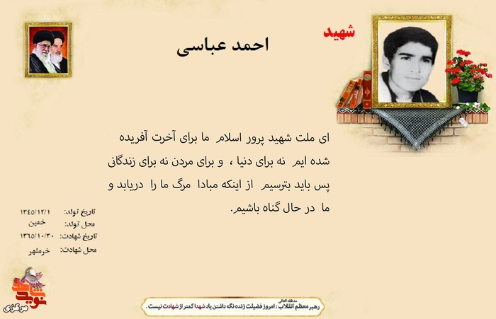 فرازی از وصیت نامه شهدا ۱۳ دی ۱۴۰۴ | ۱۰:۰۱ کد : ۵۷۴۶۹ اطلاعیه ارسال به دیگران نام شما ایمیل شما ایمیل دریافتکننده ارسال انصراف تعداد بازدید:۱۱۵ فرازی از وصیت نامه شهدا فرازی از وصیت نامه شهید بزرگوار احمد عباسی :