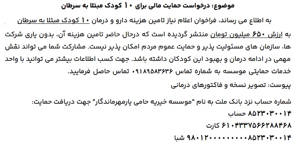 درخواست حمایت مالی، برای ۱۰ کودک مبتلا به سرطان ۰۷ بهمن ۱۴۰۴ | ۱۱:۳۳ کد : ۵۷۷۳۲ اطلاعیه ارسال به دیگران نام شما ایمیل شما ایمیل دریافتکننده ارسال انصراف تعداد بازدید:۷۳ موسسه خیریه حامی یار، درخواست حمایت مالی، برای ۱۰ کودک مبتلا به سرطان را دارد.