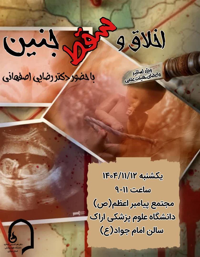 به اطلاع اساتید و اعضای هیات علمی می رساند، جلسه اخلاق و سقط جنین، در روز یکشنبه، مورخ  12/ 11/ 1404 از ساعت 9 الی 11 صبح، در مجتمع دانشگاهی پیامبر اعظم (ص) دانشگاه علوم پزشکی اراک، برگزار می گردد.